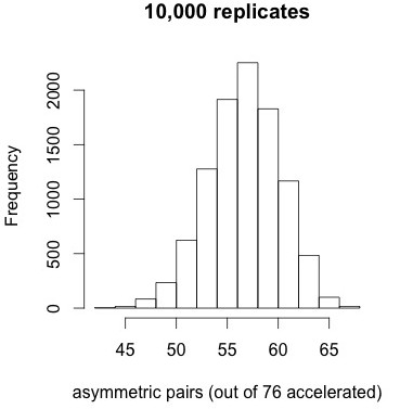 The results shown at left indicate that the tendency for accelerated pairs to be asymmetric is very striking under the correlated null model. No replicates out of 10,000 have 72 or more accelerated pairs, i.e., apparently p < 1e-4. The mean is about 57 and the standard deviation is about 3.5. Too bad this result doesn’t help us to distinguish models of duplicate gene evolution. It just tells us that when duplicate genes show accelerated evolution, the asymmetry is extreme.