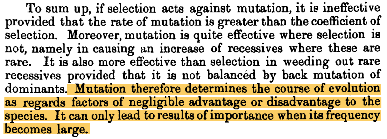 Provine (1978) identifies this argument (against evolution by mutation pressure) as one of the key contributions of theoretical population genetics to the Modern Synthesis, because it gave Darwin’s followers a seemingly rigorous basis to reject internalist theories (establishing the core Synthesis principle of There Is No Alternative). The argument was cited repeatedly by the architects of the Modern Synthesis (for examples, see Stoltzfus, 2017), and continues to be cited, e.g., Gould (2002) cites Fisher’s version of the argument and concludes that