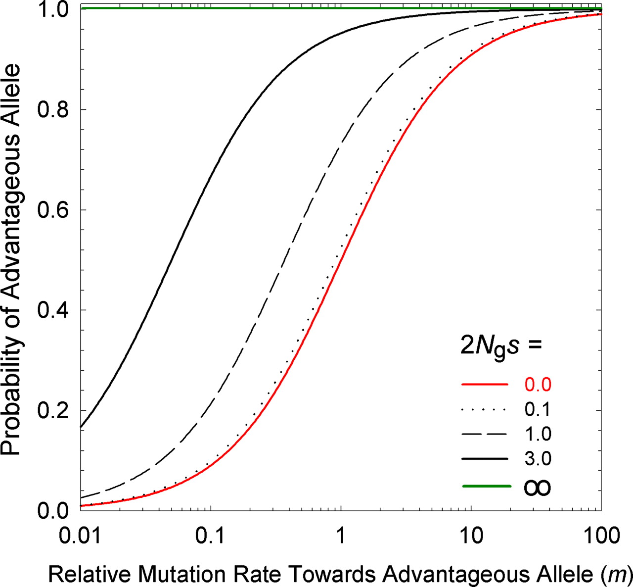 The result of this pressure (relative to a deterministic universe with only the favored codon), is to ensure that, for small values of S = 2Ngs, a substantial fraction of loci are fixed for the disfavored state; when S = 2Ngs becomes modestly large, this fraction is negligible. That is, mutation pressure, for Lynch, refers to something that ensures the predictable presence of deleterious states. By contrast, the theory of Yampolsky and Stoltzfus (2001) is about the way that biases in origination impose biases on which path, out of many possible, is taken by adaptation.