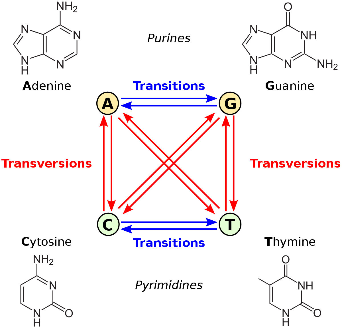 Note that transition-transversion bias is not a site-wise bias: every nucleotide site is the same in the sense of having 1 transition and 2 transversions (one blue arrow and 2 red arrows in the figure above). Also, transition bias is not a forward-reverse bias, but a difference between two types of fully reversible rates, e.g., under transition bias, the transitions A —> G and G —> A both have a higher rate than the transversions A —> T and T —> A. An insertion-deletion bias is a forward-reverse bias, but it is not a site-wise bias, in the sense that every site has the same set of possible insertions and deletions.