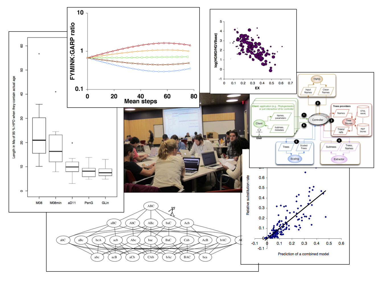 - high-level design of a system for on-the-fly delivery of phylogenetic knowledge by composition of web services, initially designed at the software hackathon shown in the center (see Stoltzfus, et al., 2013)